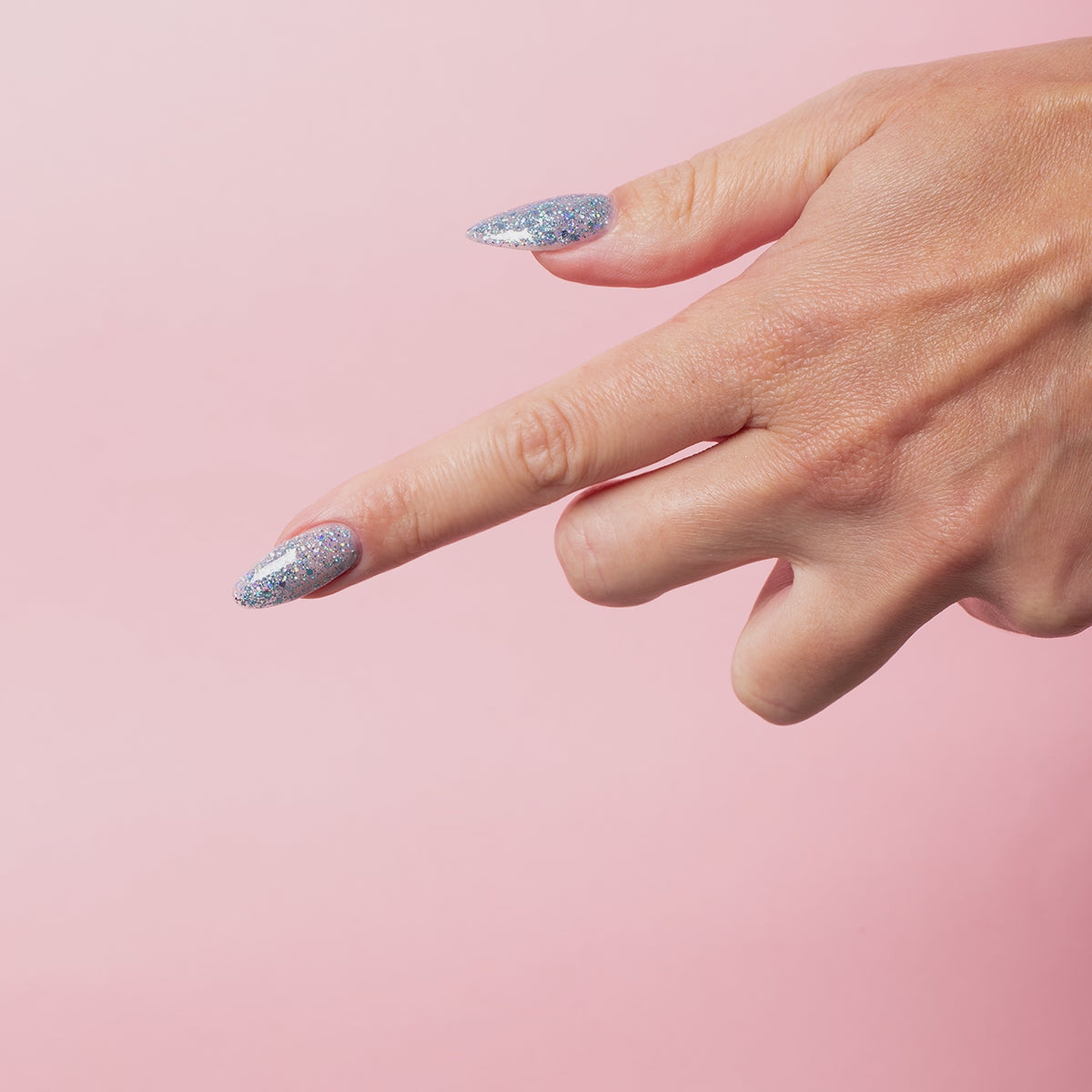 A blue glitter with varying shapes and sizes featuring a HOLO effect. This shade emits a delicate yet multidimensional sparkle, reminiscent of twinkling Christmas tree lights and ornaments.